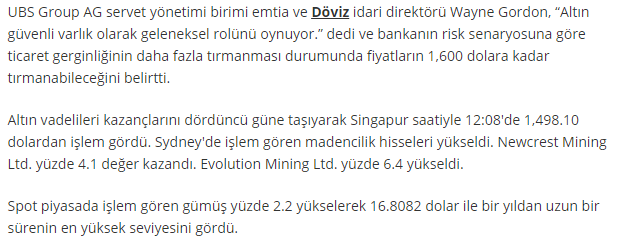 Altın, küresel piyasalardaki Washington ve Pekin arasındaki ticaret geriliminin kaynaklı kargaşadan en fazla fayda sağlayan varlıklardan biri oldu. ABD Başkanı Donald Trump, yakın zamanda Çin'e yeni vergi tehdidinde bulunurken Çin, yuanın değer kaybetmesine izin verdi. Sonrasında ise ABD Çin'i kur manipülatörü ilan etti.