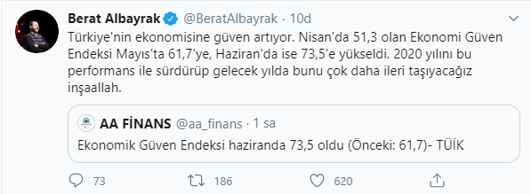 Türkiye'nin ekonomisine güvenin arttığını söyleyen Hazine ve Maliye Bakanı Albayrak, Nisan ayında %51.3 olan ekonomik güven endeksinin Haziran'da %73.5'e kadar yükseldiğini, 2020 yılını bu performans ile sürdüreceklerini belirtti. Bakan Albayrak'ın sosyal medya hesabından yaptığı değerlendirmede, "Türkiye'nin ekonomisine güven artıyor. Nisan'da 51,3 olan Ekonomi Güven Endeksi Mayıs'ta 61,7'ye, Haziran'da ise 73,5'e yükseldi. 2020 yılını bu performans ile sürdürüp gelecek yılda bunu çok daha ileri taşıyacağız inşaallah." ifadeleri görüldü.