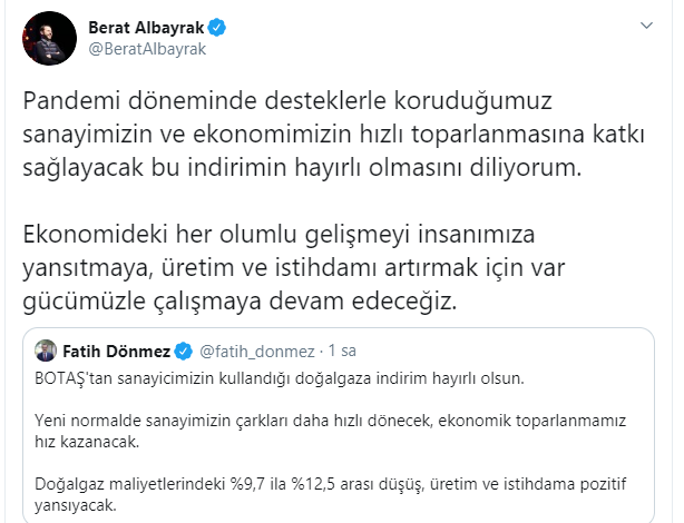 Enerji ve Tabii Kaynaklar Bakanı Fatih Dönmez, sosyal medya hesabından BOTAŞ'ın bugün açıkladığı indirim kararını paylaşmış, "BOTAŞ'tan sanayicimizin kullandığı doğalgaza indirim hayırlı olsun. Yeni normalde sanayimizin çarkları daha hızlı dönecek, ekonomik toparlanmamız hız kazanacak. Doğalgaz maliyetlerindeki %9,7 ila %12,5 arası düşüş, üretim ve istihdama pozitif yansıyacak." ifadelerini kullanmıştı.