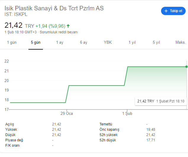 16.10 ile borsa'da işlem görmeye başlayan Işıklar Plastik, 1 Şubat'ta 21.42 seviyesine çıkarak 3 işlem gününde yatırımcısına yüzde 30 kazandırdı.
