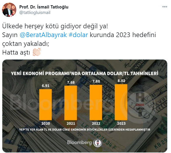 İYİ Parti TBMM Grup Başkanı, Bursa Milletvekili Prof. Dr. İsmail Tatlıoğlu, geçtiğimiz günlerde Hazine ve Maliye Bakanı Berat Albayrak tarafından açıklanan Yeni Ekonomi Programı'ndaki döviz tahminlerini hatırlatarak, 2023 hedefinde görülen Dolar fiyatlarının yakalandığınnı belirterek, "Ülkede herşey kötü gidiyor değil ya! Sayın @BeratAlbayrak #dolar kurunda 2023 hedefini çoktan yakaladı; Hatta aştı." ifadelerini kullandı.
