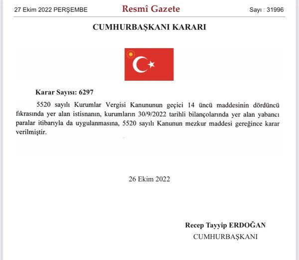 27 Ekim 2022 Tarihli ve 31996 Sayılı Resmî Gazete'de yayımlanan karara göre Kur Korumalı Mevduat (KKM) sistemine dahil olan şirketlere sağlanan vergi avantajında süre yıl sonuna kadar uzatıldı. Şirketlerin yabancı paralarını 2022 yılı sonuna kadar Türk Lirası mevduat ve katılma hesaplarına dönüşümünde vergiden müstesna olması kararı, 9 aylık bilançoları için de uygulanacak.Karara göre şirketler, 30 Eylül bilançolarındaki dövizi yıl sonuna kadar kur korumalı mevduat sisteminde tutarsa vergi ödemeyecek.