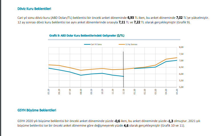Merkez Bankası'ndan yapılan açıklamada, "Cari yıl sonu döviz kuru (ABD Doları/TL) beklentisi bir önceki anket döneminde 6,93 TL iken, bu anket döneminde 7,02 TL'ye yükselmiştir. 12 ay sonrası döviz kuru beklentisi ise aynı anket dönemlerinde sırasıyla 7,11 TL ve 7,22 TL olarak gerçekleşmiştir" denildi. GSYH Büyüme beklentileri ise, "GSYH 2020 yılı büyüme beklentisi bir önceki anket döneminde yüzde -0,6 iken, bu anket döneminde yüzde -1,3 olmuştur. 2021 yılı büyüme beklentisi ise bir önceki anket dönemine göre değişmeyerek yüzde 4,6 olarak gerçekleşmiştir" şeklinde açıklandı.