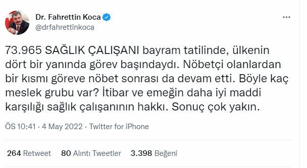 Bazı personellerin nöbet sonrası mesaiye de devam ettiği belirten Bakan Koca paylaşımında ," 73.965 Sağlık çalışanı bayram tatilinde, ülkenin dört bir yanında görev başındaydı. Nöbetçi olanlardan bir kısmı göreve nöbet sonrası da devam etti. Böyle kaç meslek grubu var? İtibar ve emeğin daha iyi maddi karşılığı sağlık çalışanının hakkı. Sonuç çok yakın." İfadelerine yer verdi.
