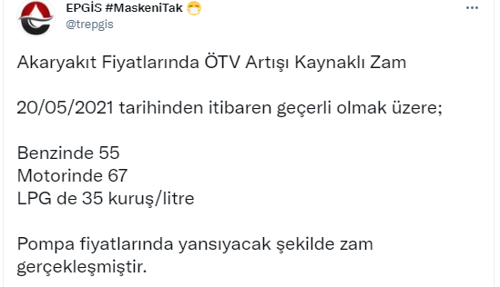 Enerji Petrol Gaz İkmal İstasyonları İşveren Sendikası, 20 Mayıs'tan itibaren geçerli ollmak üzere benzin fiyatlarında 55, Motorin fiyatlarında 67, LGP'de 35 kuruş zam yapıldığı belirtildi. İlgili açıklamada, "Akaryakıt Fiyatlarında ÖTV Artışı Kaynaklı Zam 20/05/2021 tarihinden itibaren geçerli olmak üzere; Benzinde 55 Motorinde 67 LPG de 35 kuruş/litre Pompa fiyatlarında yansıyacak şekilde zam gerçekleşmiştir." denildi.