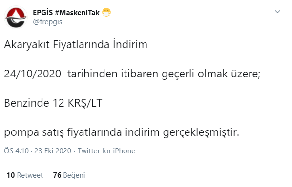 "Akaryakıt Fiyatlarında İndirim 24/10/2020 tarihinden itibaren geçerli olmak üzere; Benzinde 12 KRŞ/LT pompa satış fiyatlarında indirim gerçekleşmiştir."