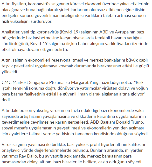 Singapur'da Phillip Futures Pte emtia kıdemli yöneticisi Avtar Sandu, "ABD dolarının güçlü seyri altında kâr satışlarını getirdi," dedi ve "Altın bir çok defa yukarı yönlü bir faktör olan kötü ABD verilerinden etkilenmedi. Ancak pandemi sarı metal ve hisse senetleri ilişkisinde olağanüstü durumlara yol açtı. Wall Street'teki güçlü satışlar, hisse senetleri ve diğer piyasalardaki kayıpları kapatmak için yatırımcıların altında satış yapmalarına neden oldu. Riskten kaçınma eğiliminin arttığı bir ortamda, yatırımcılar portföylerinde Hazine tahvili hariç diğer yatırımları kısıyor. Son yılların en yüksek seviyelerine çıkan altın fiyatları, kâr satışları için kolay bir hedef" şeklinde görüş bildirdi.