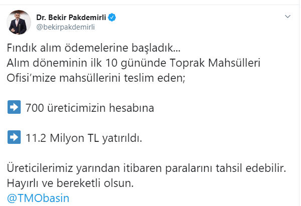 Tarım ve Orman Bakanı Bekir Pakdemirli, sosyal medya hesabı üzerinden yaptığı açıklamada TMO tarafından yapılan fındık alımlarına ilişkin ödemelerin başlayacağını duyurdu.
