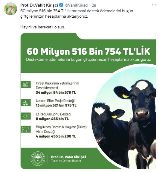 Tarım ve Orman Bakanlığından çiftçiye yeni destek ödemesi duyuruldu. Konuyla alakalı sosyal medya hesabından açıklama yapan Tarım ve Orman Bakanı Vahit Kirişci, ‘hayırlı ve bereketli olsun’ diyerek 60 milyon 516 bin 754 lira ödemenin bugün çiftçilerin hesabına yatırılacağını açıklandı
