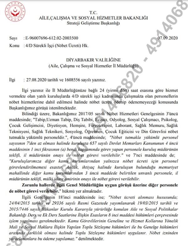 Söz konusu yazının son kısmında belirtildiği gibi nöbete kalan 4/D 'li işçilere ücret ödenebileceğine yer verildi.