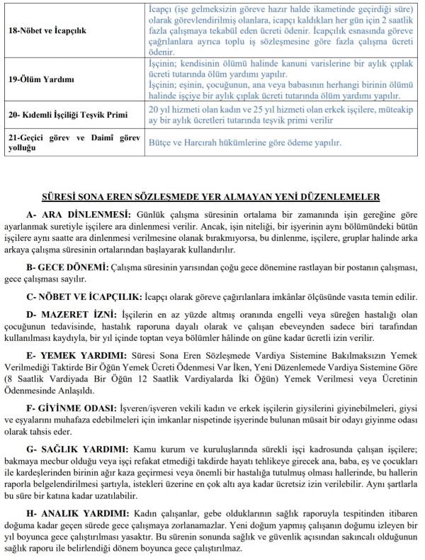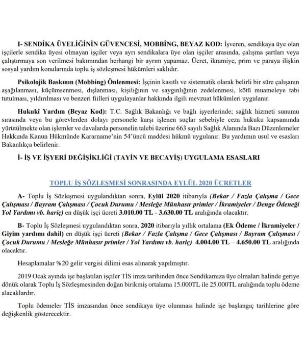 Sert açıklamasının devamında işçiler için bu sözleşmenin yeni kazanımlar sağlığını söyleyerek, "İşletme toplu iş sözleşmemiz, başta ücret ve hizmet zammı ile sosyal yardım olmak üzere, üyelerimize idari , mali ve sosyal alanda birçok yeni hak kazandırdı. Sözleşmemiz, Sağlık Bakanlığı bünyesinde süresi sona eren toplu iş sözleşmesinden faydalanan üyemiz işçilere 1 Ocak 2019 tarihinden itibaren , bunun dışında bu tarih ile sözleşmemizin imza tarihi arasında İŞKUR aracılığı ile açıktan ilk defa işe başlatılan sendikamız üyesi işçiler ile imza tarihinden önce sendikamız üyesi olanlara, işe başlangıç tarihinden itibaren uygulanacak. 696 sayılı KHK ile kadroya geçen üyemiz işçiler ise 1 Kasım 2020 itibarıyla sözleşme kapsamında olacaklar. Bu sözleşme hükümleri KHK ile kadroya geçen işçiler için yeni kazanım niteliği taşımaktadır."