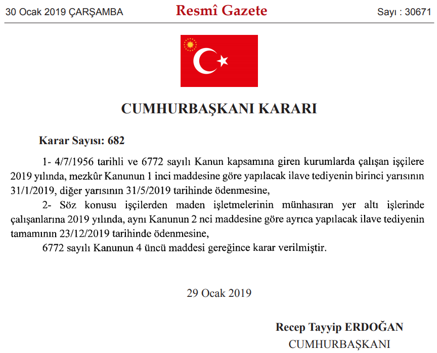 Kamu kurumları bünyesinde çalışan işçiler 31 Ocak günü ilk tediye ödemelerini aldı. Diğer tediye ödemeleri ise Mayıs ayında yapılacak. Söz konusu tediyeler için yayımlanan Cumhurbaşkanlığı kararı şu şekilde;