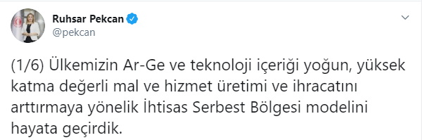 Ticaret Bakanı Ruhsar Pekcan, Resmi Gazete'de yayınmlanan Cumhurbaşkanı Kararı ile, Türkiye'nin Ar-ge yoğun, yüksek teknoloji ve katma değerli ihracat hedeflerini sağlayacak firmalara istihdam vergi destekleri gibi bir çok istisnanın hayata geçirileceğini, ihtisas serbest bölgelerine sağlanacak teşvik ve desteklerle ülkemize önemli katkı sağlanmasının hedeflendiğini söyledi.