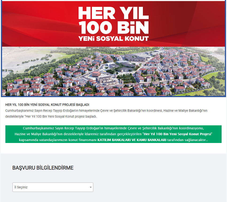 Cumhurbaşkanımız Sayın Recep Tayyip Erdoğan'ın himayelerinde Çevre ve Şehircilik Bakanlığı'nın koordinasyonu, Hazine ve Maliye Bakanlığı'nın destekleriyle İdaremiz tarafından gerçekleştirilen "Her Yıl 100 Bin Yeni Sosyal Konut Projesi" kapsamında vatandaşlarımızın konut finansmanı KATILIM BANKALARI VE KAMU BANKALARI tarafından sağlanacaktır.