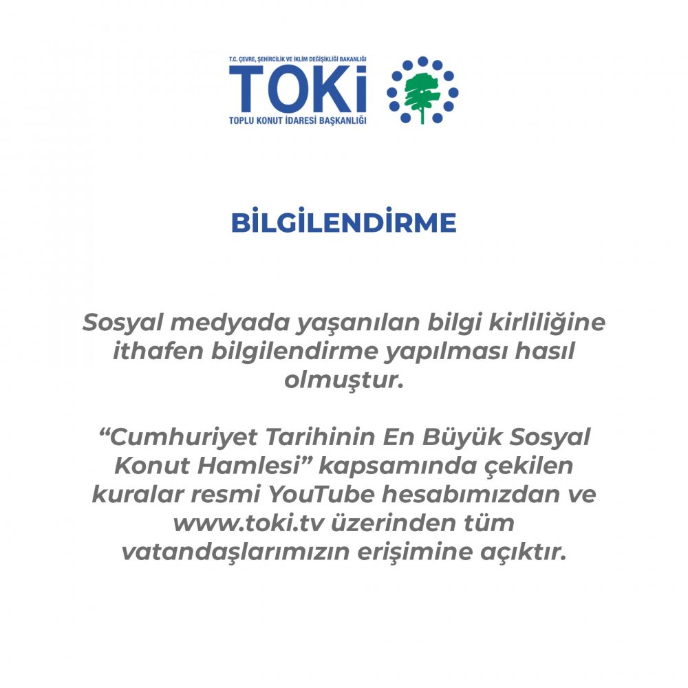 Kura çekimi ile ilgili bilgi kirliliği olduğunu belirten TOKİ, açıklamasının devamında, “Cumhuriyet tarihinin en büyük sosyal konut hamlesi kapsamında çekilen kuralar resmi YouTube hesabımızdan ve www.toki.tv üzerinden tüm vatandaşlarımızın erişimine açıktır” ifadeleri kullanıldı.