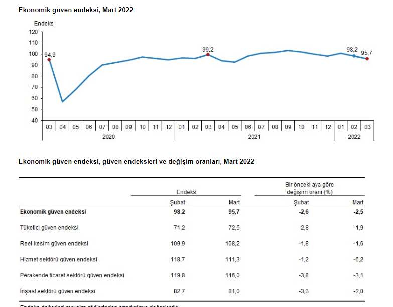 Türkiye İstatistik Kurumu (TÜİK) verilerine göre ekonomik güven endeksi Şubat ayında 98,2 iken, Mart ayında %2,5 oranında azalarak 95,7 değerine düştü. Ekonomik güven endeksindeki düşüş, reel kesim (imalat sanayi), hizmet, perakende ticaret ve inşaat sektörü güven endekslerindeki düşüşlerden kaynaklandı.