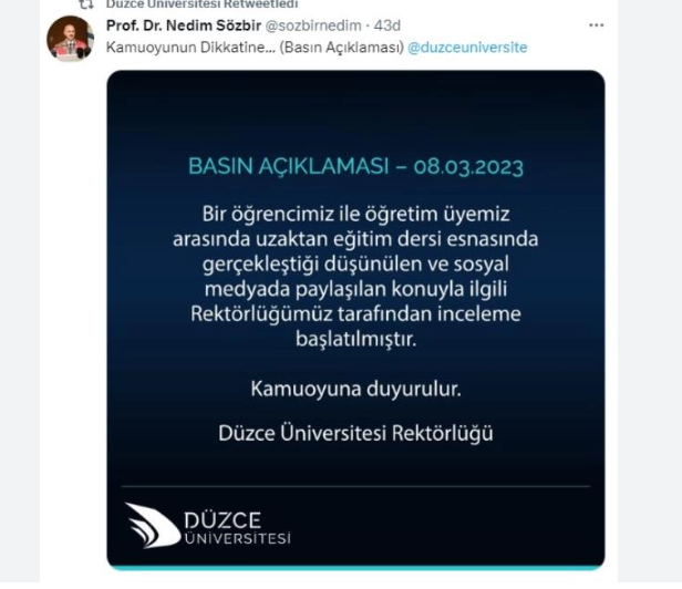 Rektör Prof. Dr. Nedim Sözbir, "Bir öğrencimiz ile öğretim üyemiz arasında uzaktan eğitim dersi esnasında gerçekleştiği düşünülen ve sosyal medyada paylaşılan konuyla ilgili Rektörlüğümüz tarafından inceleme başlatılmıştır" açıklamasında bulundu.