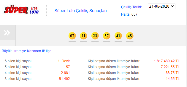 Milli Piyango İdaresi Genel Müdürlüğü tarafından yapılan açıklamaya göre, 657. haftada 5 bilen 57 kişiye 7 bin 221 lira 55 kuruş, 4 bilen 2 bin 681 kişiye 166 lira, 3 bilenlere 14 lira verileceği bildirildi. 21 Mayıs çekiliş sonuçlarına göre kazanan numaralar, 07, 11, 23, 37, 41, 48 oldu.