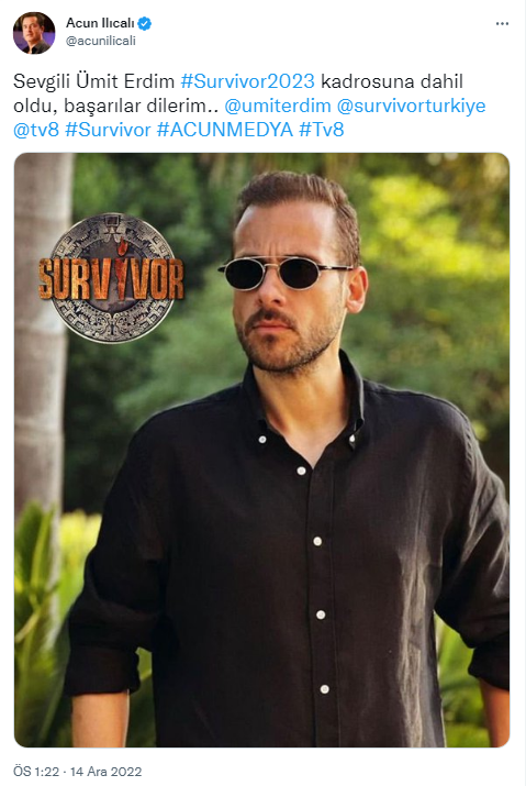 Sosyal medya hesabından paylaşım yapan Ilıcalı, “Sevgili Ümit Erdim Survivor2023 kadrosuna dahil oldu, başarılar dilerim” ifadelerini kullandı.