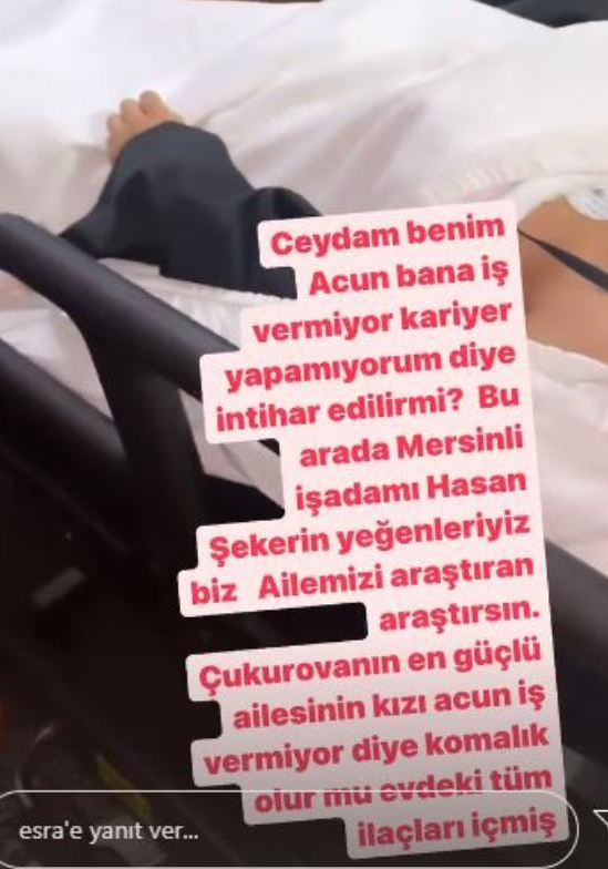 Ciciş kardeşler olarak bilinen kardeşlerden Ceyda Ersoy'un geçtiğimiz günlerde Acun Ilıcalı'nın kendisine iş vermemesi üzerine evdeki hapları içerek intihara kalkıştığı iddia edilmişti.