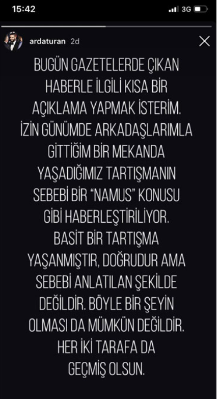Arda Turan, Berkay ile bir eğlence merkezinde yaşadığı kavgayla ilgili bazı haber siteleri ve sosyal medyada çıkan haberlerden sonra açıklama yayımladı. Başakşehir forması giyen tecrübeli futbolcu, tartışmanın konusnun 'Namus' meselesi olarak gündeme getirilmeye çalışıldığını, kavganın basit bir meseleyle çıktığını söyledi.