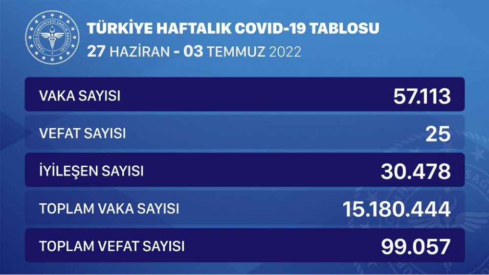 Bakanlık tarafından açıklanan resmi rakamlar göre son 1 hafta içerisinde koronavirüse yakalanan kişi sayısı geçtiğimiz haftaya göre yaklaşık 2 kat arttı ve 57 bin 113 olarak açıklandı. Hastalık sebebiyle 27 Haziran - 3 Temmuz arasında hafta da hayatını kaybeden kişi sayısı ise 25 olarak açıklandı. Bugüne kadar ülke genelinde yapılan aşı doz miktarı ise 147 milyon 839 bin 557 olarak açıklandı.