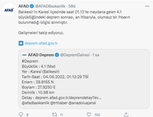 AFAD'dan ilk depreme ilişkin yapılan açıklamada, "Balıkesir'in Karesi ilçesinde saat 01.13'te meydana gelen 4,1 büyüklüğündeki deprem sonrası, an itibarıyla, olumsuz bir ihbarın bulunmadığı bilgisi alınmıştır." ifadeleri kullanıldı.