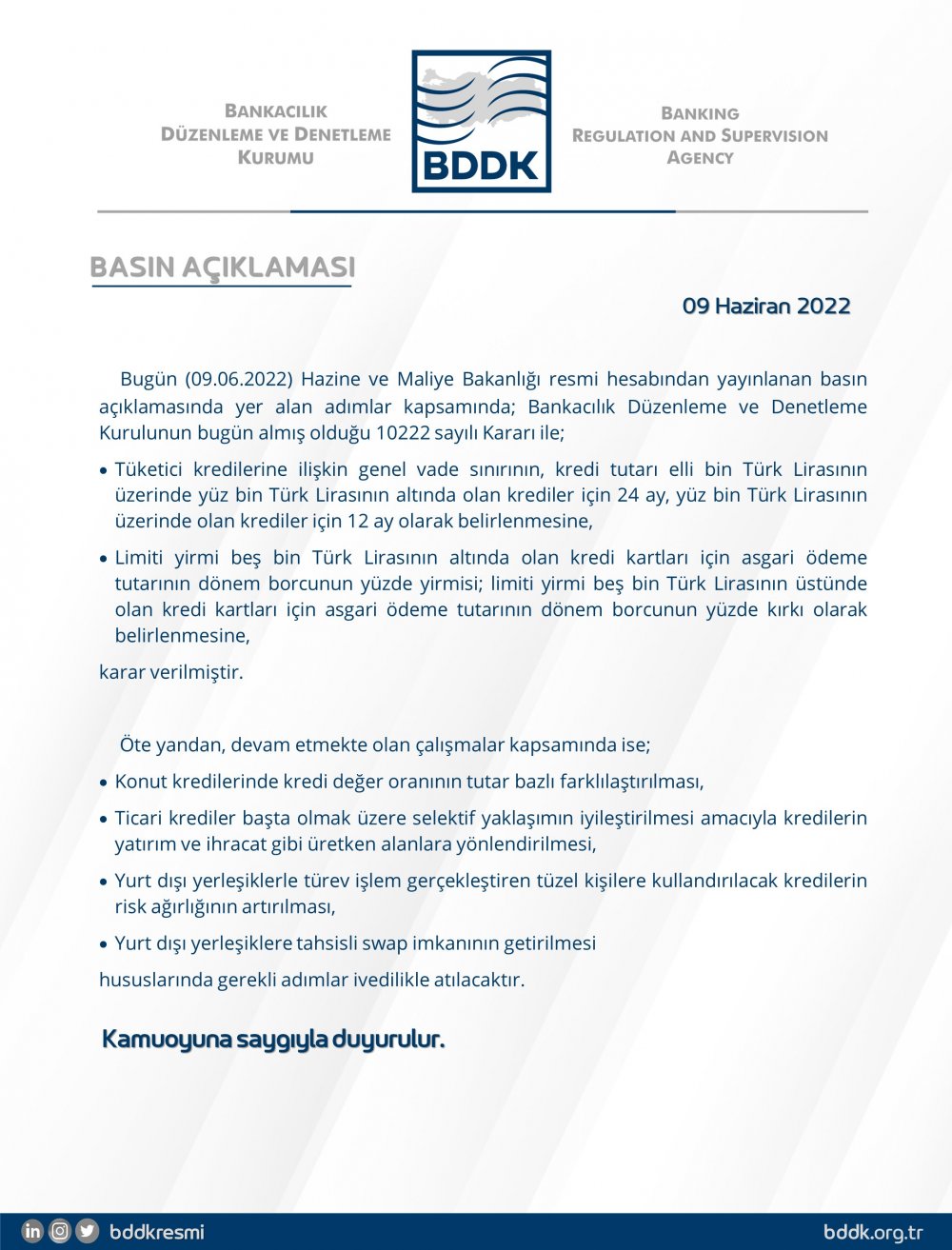 BDDK yapmış olduğu açıklamada tüketici kredilerinde 50 - 100 bin arasında çekilen krediler vadenin 24 ay, 100 bin üzerinde ki kredilerde ise vadenin 12 ay olacağını duyurdu.