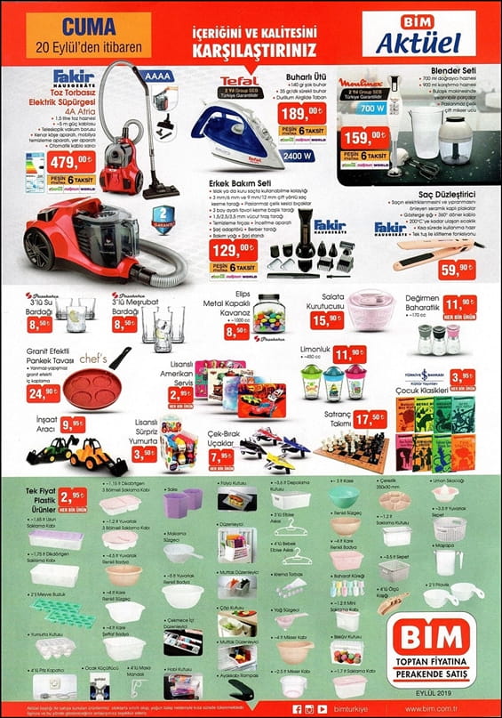 BİM 20 Eylül 2019 Aktüel ürünler kataloğu yayımlandı. Sınırlı stok ile satışa sunulacak ürünlerin başında Volta Elektrikli Bisiklet ile Toz torbasız elektrikli süpürge öne çıkarken, Samsung Galaxy 130 Cep telefonu, blender seti, tefal buharlı ütü, Fakir marka saç düzleştirici, erkek bakım seti, ayakkabı, Amerikan servis ve çok daha fazlası bulunuyor. BİM tarafından yapılan bilgilendirmede, 3 kademe LED akü seviye göstergesi ile ön plana çıkan Volta elektrikli bisiklet 1.999 TL'den, Samsung Galaxy a30 cep telefonu yarından itibaren BİM mağazalarında 1.799 TL'den , 1.5 litre toz haznesi bulunan Fakir 4A Atria toz torbasız elektrikli süpürge 479 TL'den, Tefal buharlı ütü 189 TL'den satışa sunulacak.