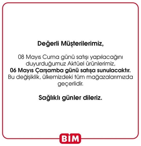 Bim market resmi instagram adresinden yapılan açıklamada 8 Mayıs 2020 günü indirime gireceği açıklanan ürünlerin 6 Mayıs 2002 Çarşamba gününe alındığı ve indirimlerin 6 Mayıs 'ta tüm şubelerden satılacağına yer verildi.