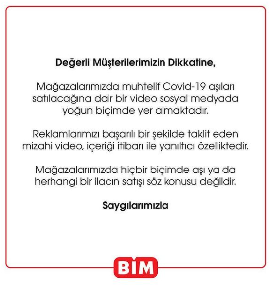 BİM marketler tarafından söz konusu video ile ilgili yapılan açıklamada "Değerli müşterilerimizin dikkatine, Mağazalarımızda muhtelif Covid-19 aşıları satılacağına dair bir video sosyal medyada yoğun biçimde yer almaktadır. Reklamlarımızı başarılı bir şekilde taklit eden mizahi video, içeriği itibarı ile yanıltıcı özelliktedir.