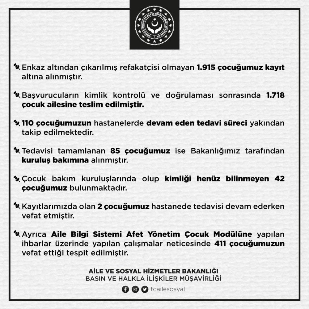 Refakatsiz çocuklarla alakalı olarak açıklama yapan Bakan Yanık, bugüne kadar Bakanlık olarak sistemlere 1915 refakatsiz çocuğu kaydedilğini, bunlardan 1718’inin ailelerine teslim edildiğini aktardı. Şu anda hastanede takip edilen çocuk sayının ise 110 olduğunı söyleyen Bakan Yanık"Hastanede tedavisi devam ederken iki çocuğumuz maalesef hayatını kaybetti. Kuruluş bakımına aldığımız 85 çocuğumuz, halihazırda mevcut kuruluş bakımında olup da hala daha kimliği belirlenememiş çocuk sayısı 42. Oldukça yüksek sayılardan 42’ye kadar getirdik. İnşallah o çocuklarımızın da kimliklerini tespit edip eğer aileleri varsa onlara ulaşmak değilse kuruluşlarımızda bakımlarını devam ettireceğiz. Maalesef bunların dışında 411 çocuğumuzun da depremde vefat ettiğini tespit ettik. Bunlardan bir kısmı ailelerine bilgisini bir kısmını teslimini yaparak süreci devam ettiriyoruz." ifadelerini kullandı.