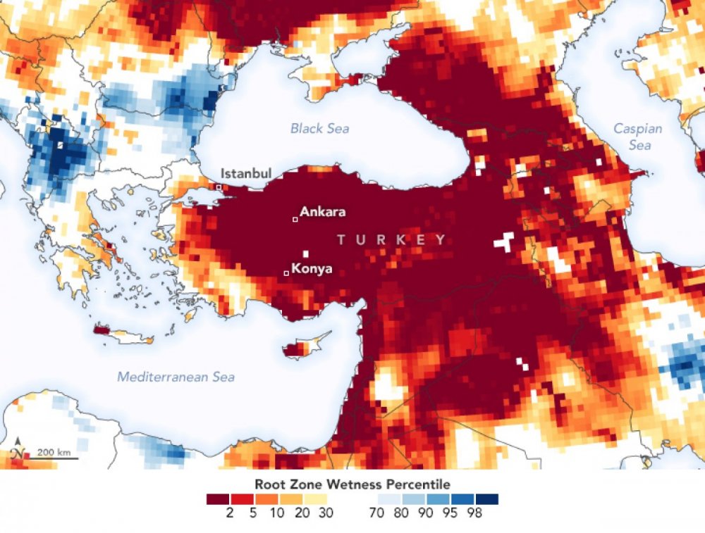 "Ortalamanın altında yağışlar, Türkiye'nin içme suyu kaynaklarını ve yer altı su miktarını etkiledi. NASA'nın GRACE-FO uydusunun ölçümleri, ülkenin sığ yer altı suyu rezervlerini ve toprak nemini gösteriyor."