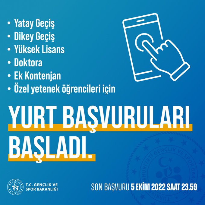 Gençlik ve Spor Bakanlığı, Ek Kontenjan, Yatay Geçiş, Dikey Geçiş, Doktora ve Özel Yetenek Öğrencileri için yurt başvurularının başladığını duyurdu. Başvurular iki gün sürecek ve son başvuru tarihi 5 Ekim 2022 saat 23.59’a kadar devam edecek.