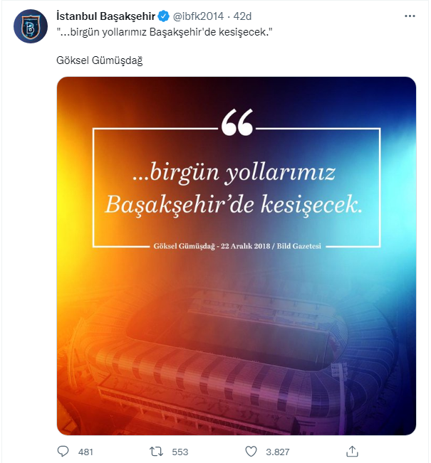 Medipol Başakşehir'in Başkanı Göksel Gümüşdağ'ın 2018'deki Mesut Özil ile ilgili ''Birgün yollarımız Başakşehir'de kesişecek sözü'' paylaşımı sosyal medyaya bomba gibi düştü. Takımın sosyal medya hesabından o sözler paylaşıldı.