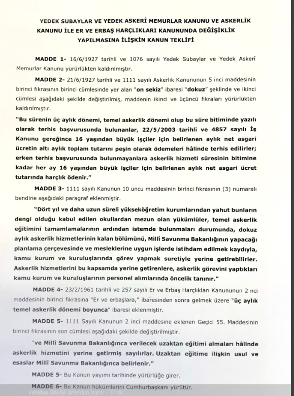 Teklifle birlikte tektip askerlikte 3+6 askerliğin gündeme gelmesini, bedelli askerlikte mevcut müracaatların uzaktan eğitimle tamamlanmasının öngörüldüğünü açıklayan Bahşi, üniversite mezunlarının askerlik hizmetini, temel eğitimin ardından mesleklerine uygun şekilde kamu kurumlarında yapılmasını, askerlik hizmetinin sona ermesinden sonra ilgili kurumlarda bu kişilerin istihdamına öncelik tanınmasını teklif ettiklerini açıkladı. TBMM Başkanlığına bugün İYİ Partili Bahşi, Yavuz Ağıralioğlu, Ahat Andican, Ahmet Kamil Erozan, Mehmet Metanet Culhaoğlu , Orhan Çakırlar'ın imzasını taşıyan teklifin sunulduğu bildirildi. İlgili kanun teklifine aşağıdan göz atabilirsiniz :