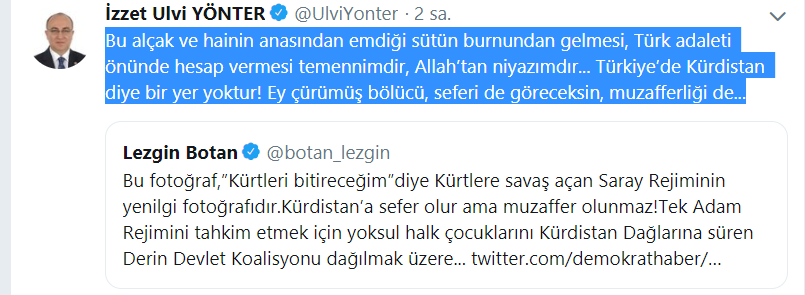 MHP Genel Başkan Yardımcısı Yönter de HDP'li Botan'a tepki gösterdi. Yönter, "Bu alçak ve hainin anasından emdiği sütün burnundan gelmesi, Türk adaleti önünde hesap vermesi temennimdir, Allah’tan niyazımdır... Türkiye’de Kürdistan diye bir yer yoktur! Ey çürümüş bölücü, seferi de göreceksin, muzafferliği de..." dedi.