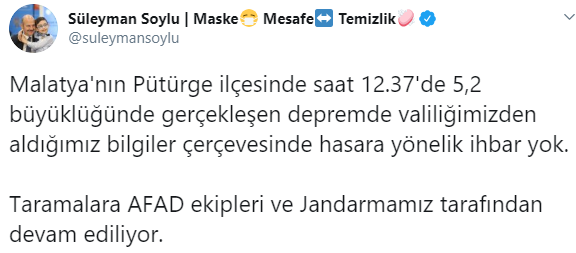 İçişleri Bakanı Süleyman Soylu da, depreme ilişkin sosyal medya hesabından bilgilendirmede bulundu. Bakan Soylu'nun paylaşımında, "Malatya'nın Pütürge ilçesinde saat 12.37'de 5,2 büyüklüğünde gerçekleşen depremde valiliğimizden aldığımız bilgiler çerçevesinde hasara yönelik ihbar yok. Taramalara AFAD ekipleri ve Jandarmamız tarafından devam ediliyor." ifadeleri görüldü.