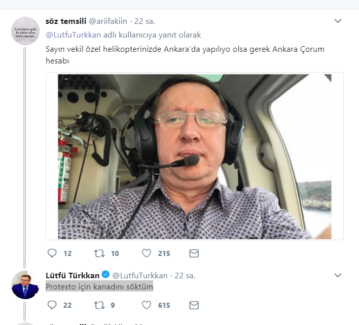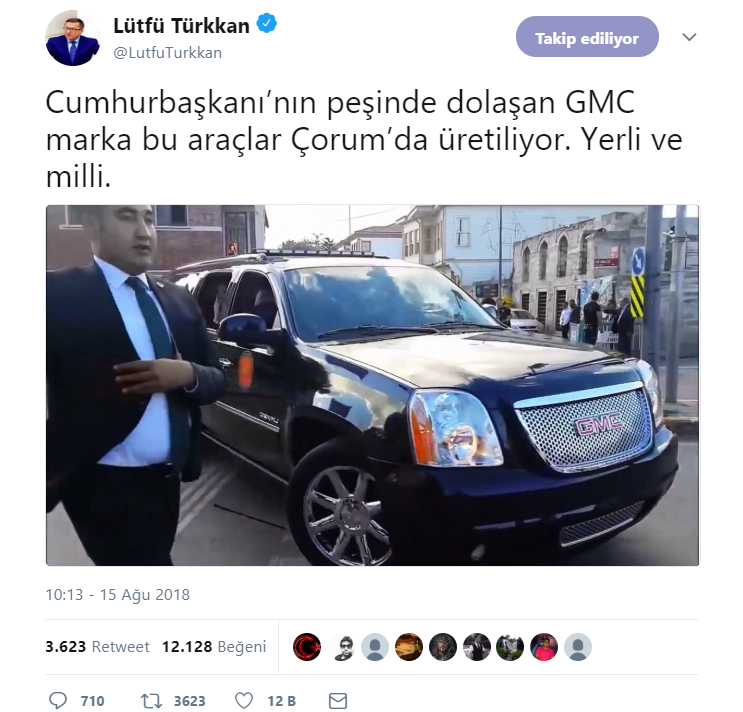 Cumhurbaşkanlığı konvoyunda bulunan GMC marka araçları örnek gösteren Türkkan, ilgili araçlardan birisinin fotoğrafını paylaşarak, "Cumhurbaşkanı’nın Betpark peşinde dolaşan GMC marka bu araçlar Çorum’da üretiliyor. Yerli ve milli." ifadelerini kullandı. Türkkan'ın bu paylaşımına bir takipçisi "Sayın vekil özel helikopterinizde Ankara’da yapılıyo olsa gerek Ankara Çorum hesabı" şeklinde yorum yapınca, Türkkan, "Protesto için kanadını söktüm" yanıtını verdi.