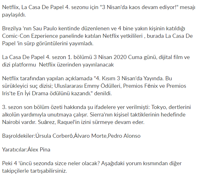 Açıklamada , La Casa de Papel dizisinin 4 'üncü sezonu 1. bölümünün 3 Nisan 2020 günü yayımlanacağına yer verildi. Bu açıklama sonrası ilk görüntü yayımlanmıştı. Sade bir görüntü sonrası beklenen fragman bugün yayımlandı.