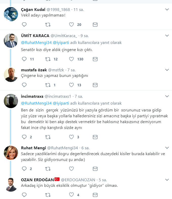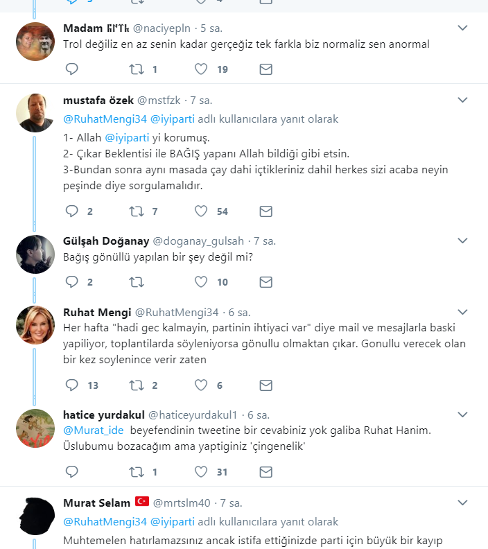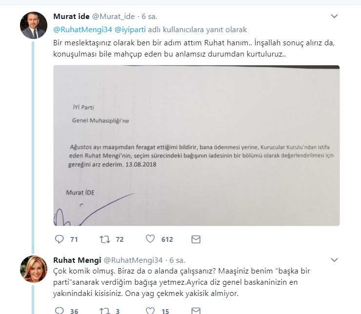 İYİ Parti'de Akşener'in en yakınındaki isimlerden birisi olan Murat İde, "Bir meslektaşınız olarak ben bir adım attım Ruhat hanım.. İnşallah sonuç alırız da, konuşulması bile mahçup eden bu anlamsız durumdan kurtuluruz.." şeklinde bir yanıt verdikten sonra "Ağustos ayı maaşından vazgeçtiğini ve söz konusu maaşın Kurucular Kurulu'ndan istifa eden Ruhat Mengi'ye verilmesini arz ettiğini bildiren" dilekçeyi paylaştı. İYİ Partili bir çok isiminde "hesap numaranı ver de paranı gönderelim sus" şeklinde mesaj attığı görüldü.