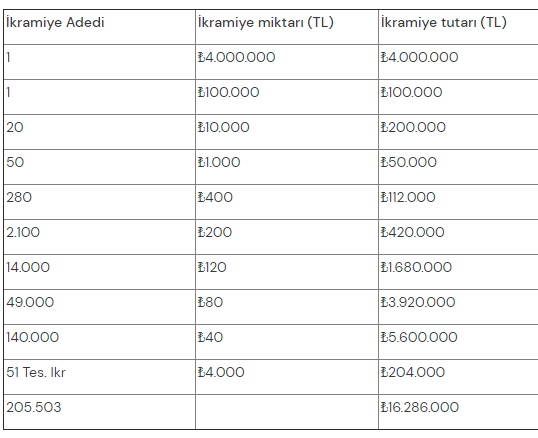 4 milyon lira olan büyük ikramiyeyi kazanan bilet numarası, 065608 olarak belirlendi, 325797 numaralı bilet ise 1 milyon liralık ikramiye kazandı.