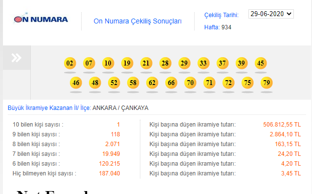 Her haftanın Pazartesi günü gerçekleştirilen On Numara çekilişinde bu haftanın sonuçları şu şekilde: