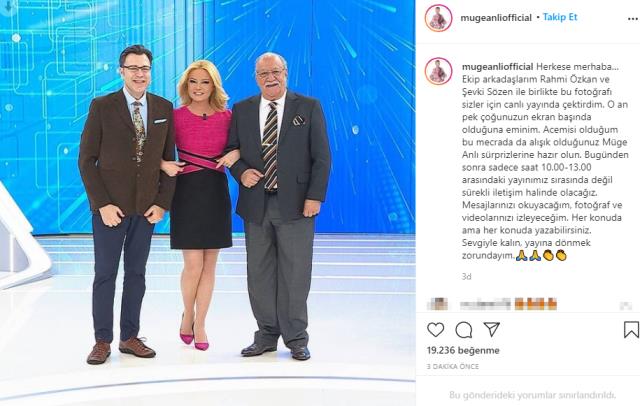 Sosyal medya hesabından açtığı hesaba kısa sürede 421 bin takipçi gelen Müge Anlı, hesabından yayımladığı ilk mesajda, birlikte program yaptığı Rahmi Özkan ve Şevki Sözen'le bir fotoğrafını ekleyrek, "Herkese merhaba… Ekip arkadaşlarım Rahmi Özkan ve Şevki Sözen ile birlikte bu fotoğrafı sizler için canlı yayında çektirdim. O an pek çoğunuzun ekran başında olduğuna eminim. Acemisi olduğum bu mecrada da alışık olduğunuz Müge Anlı sürprizlerine hazır olun. Bugünden sonra sadece saat 10.00-13.00 arasındaki yayınımız sırasında değil sürekli iletişim halinde olacağız. Mesajlarınızı okuyacağım, fotoğraf ve videolarınızı izleyeceğim. Her konuda ama her konuda yazabilirsiniz. Sevgiyle kalın, yayına dönmek zorundayım" ifadelerini kullandı.
