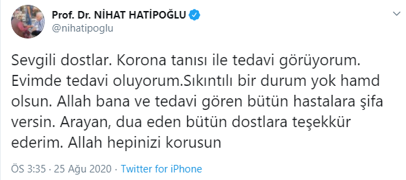 "Sevgili dostlar. Korona tanısı ile tedavi görüyorum. Evimde tedavi oluyorum. Sıkıntılı bir durum yok hamd olsun. Allah bana ve tedavi gören bütün hastalara şifa versin. Arayan, dua eden bütün dostlara teşekkür ederim. Allah hepinizi korusun"