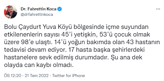 Koca, Twitter hesabından yaptığı açıklamada, "Bolu Çaydurt Yuva köyü bölgesinde içme suyundan etkilenenlerin sayısı 45'i yetişkin, 53'ü çocuk olmak üzere 98'e ulaştı. 14'ü yoğun bakımda olan 43 hastanın tedavisi devam ediyor. 17 hasta başka şehirlerdeki hastanelere sevk edilmiş durumdadır. Şu ana dek olayda can kaybı olmadı." ifadelerini kullandı.