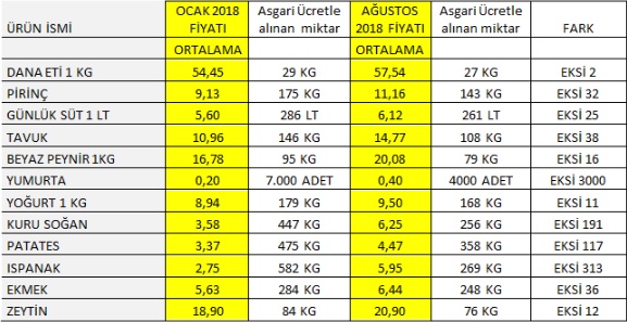 1.603 TL Asgari ücret ile geçinin 4 kişilik bir ailenin aylık mutfak harcamalarında yaşanan değişimler ve ailelerin aylık mutfak masraflarına yönelik yapılan harcamaların değişimleri Ocak -Ağustos ayları arasında; Yukarıda verilen temel besin maddelerinin Ocak ve Ağustos ayı arasında ki fiyat farklarında yaşanan değişim neticesinde, Asgari ücret ile geçinen 4 kişilik bir ailenin mutfağında ki temel besin gıda oranlarının alımında ki düşüş dikkat çekmektedir.