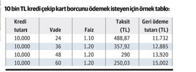 Buna göre Birleştiren İhtiyaç Kredisi 'nin; kredi kartlarına uygulanan aylık faiz oranlarından çok daha uygun şartlar altında verileceği belirtilirken, 24 aya kadar aylık yüzde 1.10 ve 60 aya kadar aylık yüzde 1.20 faiz oranlarıyla vatandaşlara kredi verileceği bildirildi.