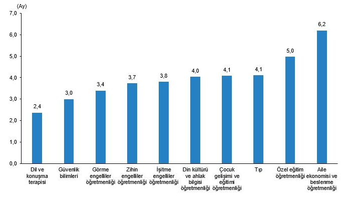 Lisans mezunlarının mezuniyetleri sonrası ilk iş bulma süre ortalamasının en kısa olduğu beş bölüm; dil ve konuşma terapisi (2,4 ay), güvenlik bilimleri (3,0 ay), görme engelliler öğretmenliği (3,4 ay), zihin engelliler öğretmenliği (3,7 ay) ve işitme engelliler öğretmenliği (3,8 ay) oldu.
