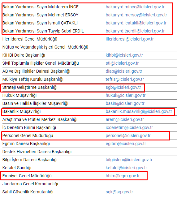 Aşağıda kırmızı kutu içinde gösterilen adreslere de mesaj atmanız durumunda sesiniz daha fazla yönetici ve bürokrata ulaşır.